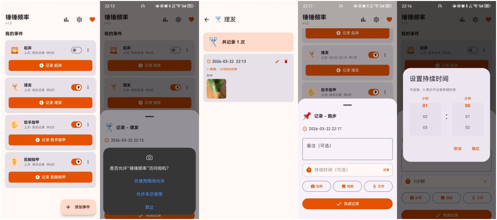 - 一键记录自定义事件,可记录持续时间、添加附件