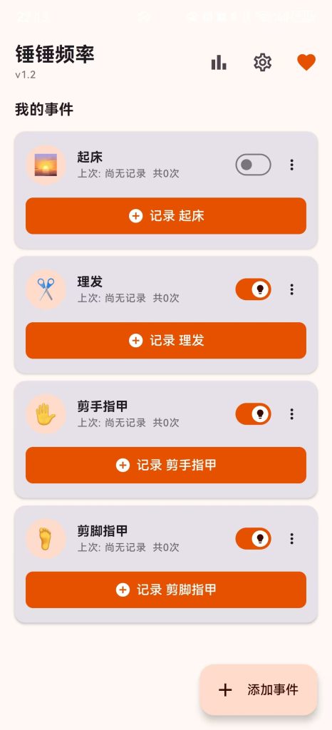 - 事件卡片列表:展示所有事件,显示上次记录时间和累计次数
