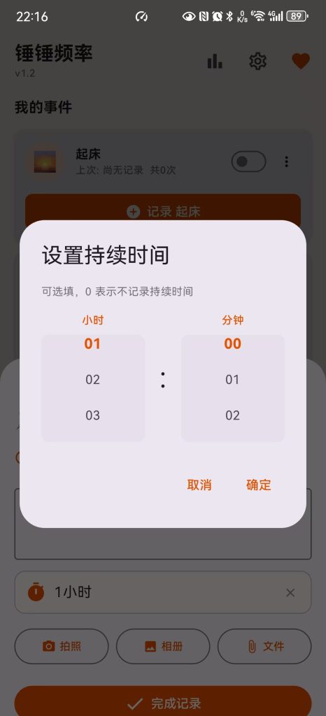 - 持续时间:滚轮选择器,小时(00-23 循环滚动)+ 分钟(00-59 循环滚动)
